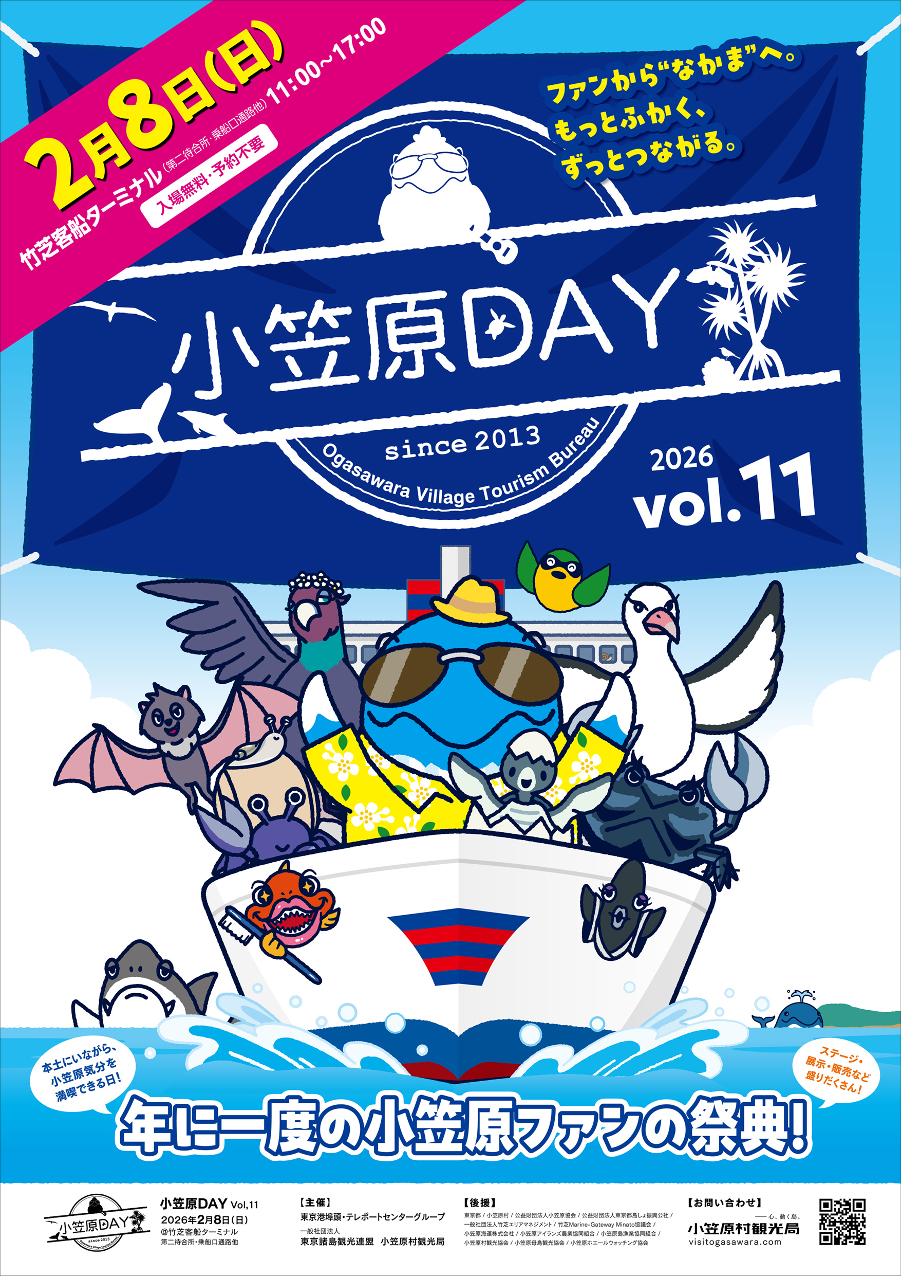 2月8日(日)に竹芝客船ターミナルにおいて、小笠原DAYが開催されます! 今年で11回目を迎えるこのイベントは、本土で小笠原を味わえる祭典として毎年賑わいを見せています。 2026年は小笠原諸島が遺産…