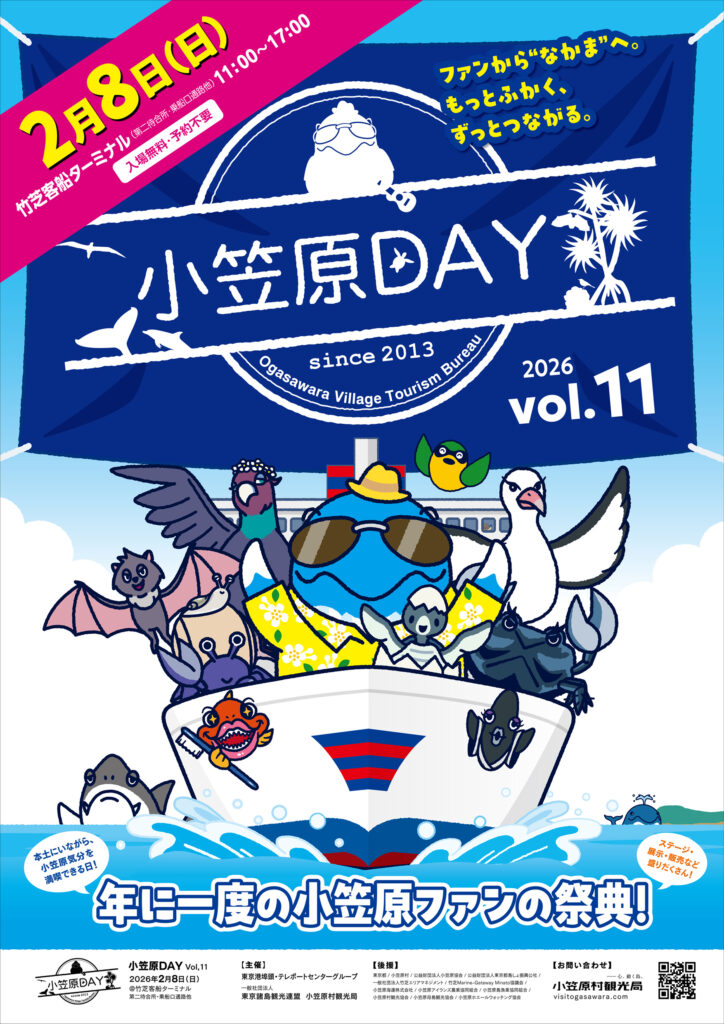 小笠原DAYが開催されます! 2026.2.1 2月8日(日)に竹芝客船ターミナルにおいて、小笠原DAYが開催されます! 今年で11回目を迎えるこのイベントは、本土で小笠原を味わえる祭典として毎年賑わいを見せています。 2026年は小笠原諸島が遺産登録15周年を迎える節目ということで、出展ブースでは、化中の小笠原について紹介します。また、同じ年に文化遺産に登録された平泉も出展しますので、この機会に是非お越しください! 詳細は小笠原観光局のサイトをご覧ください。